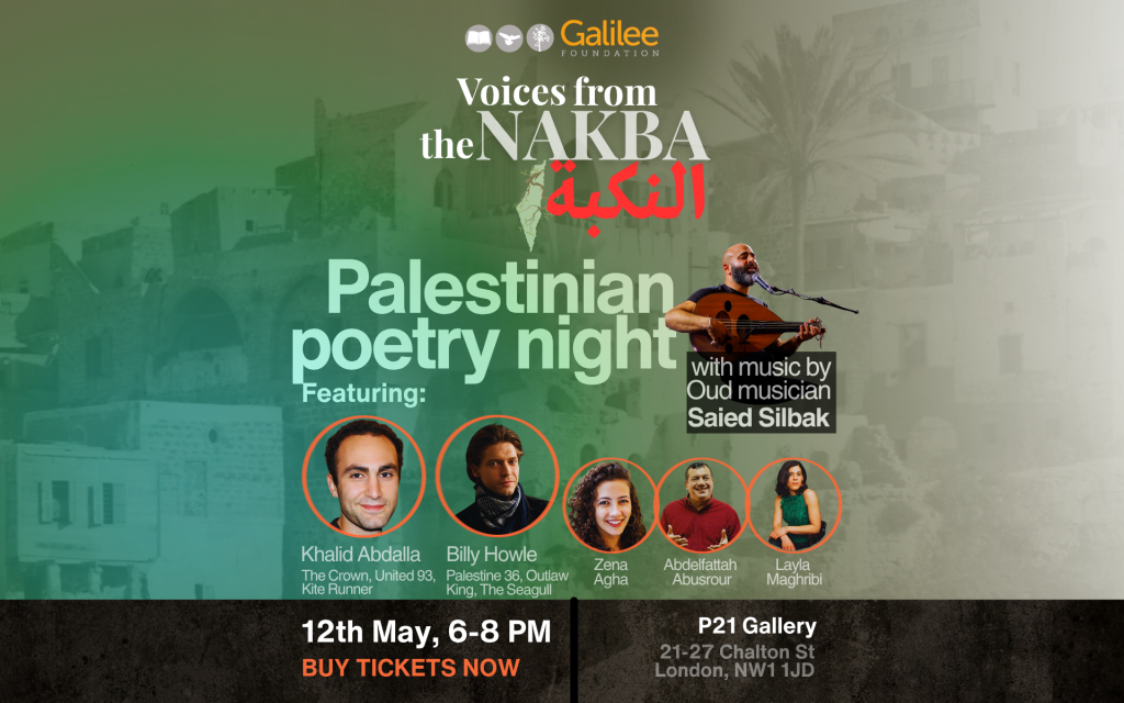 12th May: Palestinian poetry night featuring readings by actors Khalid Abdalla, Billy Howle, and Palestinian poets Zena Agha, Abdelfattah Abusrour, and Layla Maghribi