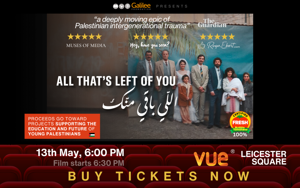 Join the Galilee Foundation’s charity screening of the acclaimed “All That’s Left Of You”, directed by the award-winning director Cherien Dabis and featuring an all-star cast including Saleh Bakri and the late Mohammed Bakri.